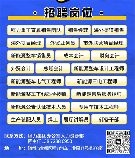 程力汽車集團(tuán)2025年近期正在招聘多個(gè)職位,包括但不限于銷售、技工、工程師,新能源車型技術(shù)人員和海外銷售人員等。以下是一些具體的招聘信息: