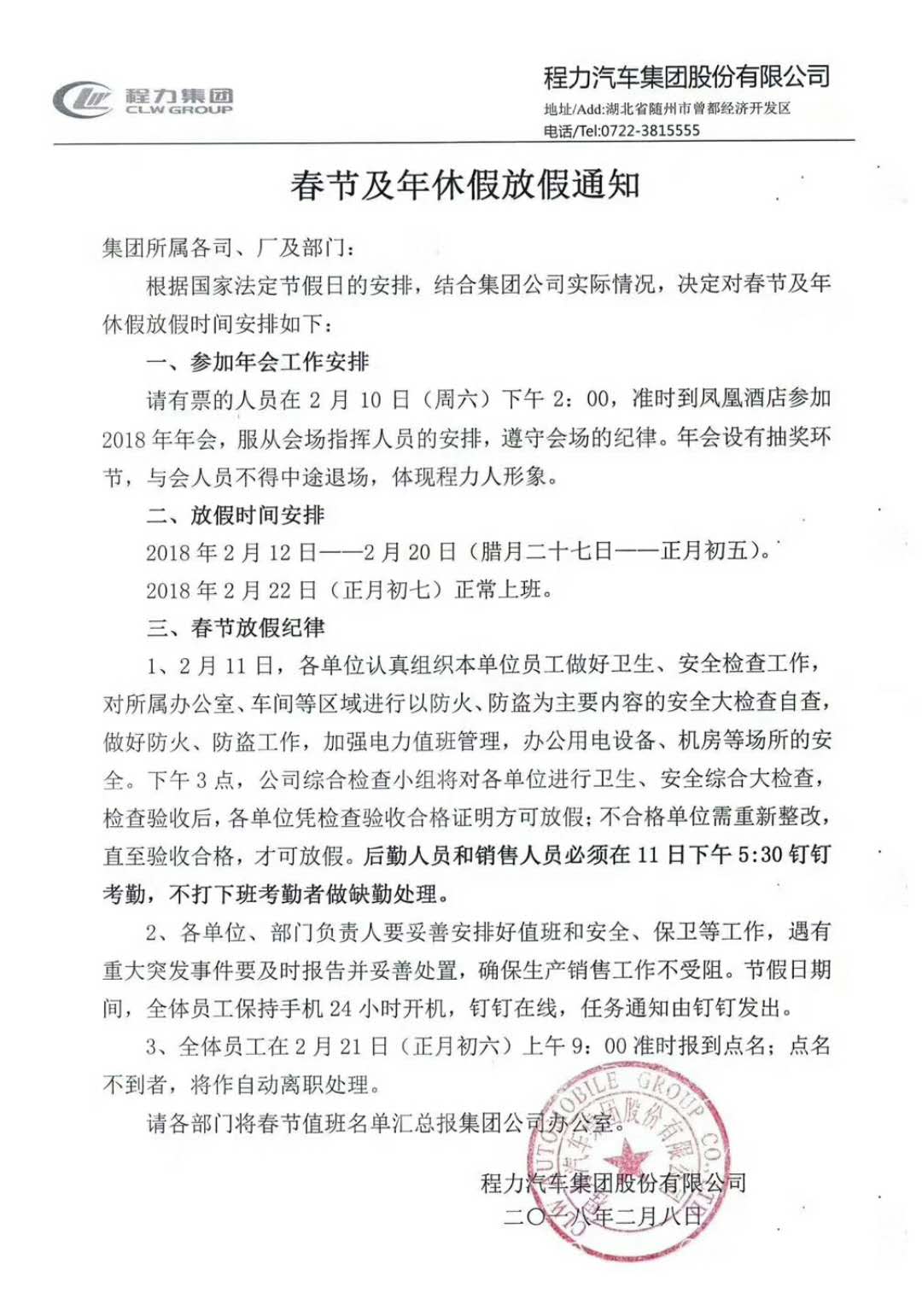 湖北程力汽車(chē)集團(tuán)股份有限公司2018年春節(jié)及年休假放假通知