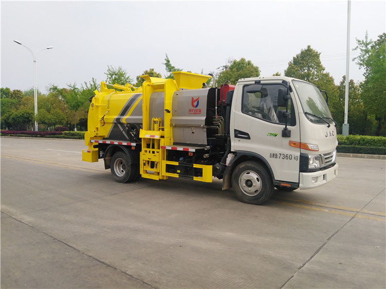 湖北程力國六江淮駿鈴5方餐廚垃圾車(方罐)程力威牌CLW5081TCAH6型餐廚垃圾車 廠家配置: 湖北程力國六江淮駿鈴6方餐廚垃圾車(方罐)底盤配置:江淮駿鈴V6駕駛室2071寬體,3365軸距,云內德威163馬力D30TCIF2(120KW),六齒六檔變速箱,動轉,中控鎖,電動玻璃,多功能方向盤,日間行車燈,空調,斷氣剎,前橋3噸,后橋7.2噸,750R16LT 14PR鋼絲胎。 湖北程力國六江淮駿鈴6方餐廚垃圾車(方罐)改裝標配:(1)弧形箱體,箱體材質為4mm。(2)合肥皖液油泵,江蘇多路閥,國產液壓油缸。(3)推鏟卸料(不帶舉升功能),具有干濕分離功能。液壓后蓋,后蓋帶密封條。(4)后門液壓鎖緊。(5)拉桿式提升機,掛240L標準塑料垃圾桶。進料口蓋液壓開關。(6)駕駛室內集中電控(提升機外部手動控制),后門鎖緊與后蓋開關的操作具有防誤操作。(7)箱體帶清洗裝置(液壓馬達帶動高壓泵、帶水箱) 湖北程力國六江淮駿鈴5方餐廚垃圾車(方罐)程力威牌CLW5081TCAH6型餐廚垃圾車圖片價格: