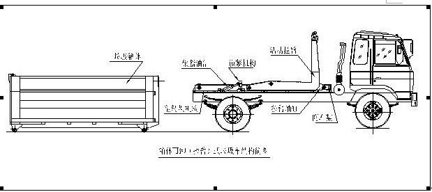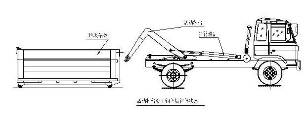 拉臂式垃圾車(車廂可卸式垃圾車)使用說明 一、概述 什么是勾臂垃圾車? 車廂可卸式垃圾車又稱拉臂式垃圾車(以下簡稱垃圾車)是用于城鎮(zhèn)袋裝、散裝生活垃圾物的收集、運輸、卸料作業(yè)的專用車輛。 該車是由汽車底盤、拉臂主油缸、附車架、翻轉架、支撐腿(選裝)、鎖緊架、鎖緊油缸及多路換向閥等組成。翻轉架一端連在附車架上,其另一端設有活動拉臂,中間安裝有鎖緊系統(tǒng);活動臂油缸一端連在活動臂上,另一端連接在附車架上;鎖緊機構通過鎖緊油缸的動作可以在箱體自卸時將附車架上的箱體與翻轉架及拉臂連為一體,在主油缸伸出時形成自卸角,也可以通過鎖緊油缸的收回把翻轉架與附車架鎖緊為一體,利用主油缸的收回或伸出使活動拉臂將地下的垃圾箱拖拉至附車架上或從附車架上放回到地面。 該車可將地下垃圾箱內的垃圾及垃圾箱一同拉至車上運走同時可自卸,降低了工人的勞動強度。該垃圾車的收運方式是目前世界上廣泛采用的垃圾收運方式,可以實現(xiàn)一車多箱,大大降低了配備成本和空間等等;其專用裝置的功能均以汽車發(fā)動機為動力,通過液壓機構手動或電控來實現(xiàn)。車輛的箱體采用優(yōu)質炭鋼板全密封焊接結構,具有強度高、重量輕、不產生二次污染等優(yōu)點。 二、結構簡圖 三、操作步驟 在裝載垃圾前,空載運轉達到6個標準氣壓時,掛上取力器(駕駛室內方向盤左下方),檢查各部件有無泄漏或異常后,再按照操作指示牌指示位置進行操作;其具體操作步驟如下: 拉起垃圾箱體 步驟1.將鎖緊鉤操作手柄推至收回位置,鎖緊油缸收回,使鎖緊架收回并將翻轉架與附車架鎖緊固定;如圖: 步驟2.將拉臂操作手柄拉起到伸起位置,拉臂油缸伸出,活動拉臂繞翻轉翻轉架前鉸鏈軸旋轉,拉臂處于鉤箱位置,適當調整拉臂鉤高度并與箱體彎鉤對準;如圖: