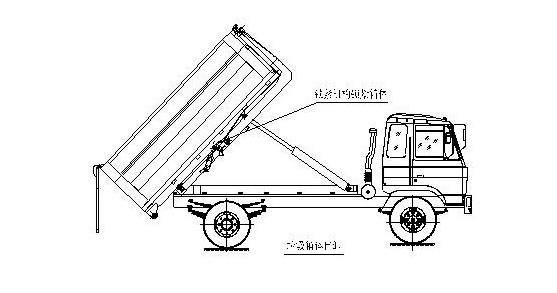 完成垃圾箱體的上車工作,松開取力器,整車可以運輸行駛。 步驟5. 在卸垃圾前,整車運轉達到6個標準氣壓時掛上取力器,打開垃圾箱后門鎖緊裝置,在前級二聯(lián)多路閥處,首先確定鎖緊架鎖緊垃圾箱體(拉起鎖緊鉤操作手柄至鎖緊位置),然后拉起拉臂操作手柄至伸出位置,垃圾箱體備傾斜舉起垃圾卸出;如圖: