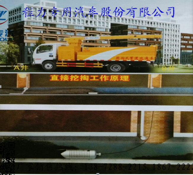 該車可以將300-1500mm管徑下水道中的堵塞物挖掏物清理干凈,該車工作效率高、勞動強度小,清率淤達到95%