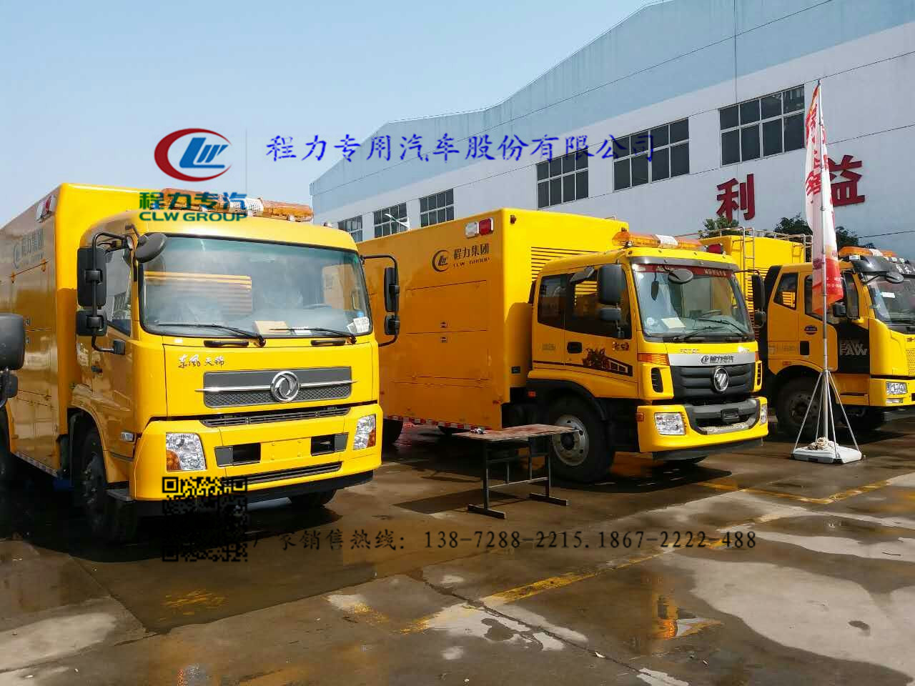 發電機組:發動機備用功能120KW額定輸出功率110KW,額定頻率50HZ,額電壓230/400V,康明斯發動機,調速方式:電子調速,啟動電瓶,電瓶總閘  程力專用汽車股份有限公司 聯系人:王經理 銷售熱線:13872882215 微信:18672222488  真空輔助自吸泵:配備一臺一體式真空輔助自吸排污泵,流量1000m3/h,電機功率55kw,揚程12m,吸程8m,安裝在車輛尾部,方便拆卸水管及出水,該泵無需罐水,無需額外增加水環泵輔助抽真空,性能好,出水快,水泵啟動采用軟啟動 外部照明燈:車廂后頂部安裝升降照明燈,燈具個功率150*2=300W.光源形式LED燈,(二聚光,二泛光);燈桿舉起高度1800mm水平旋角360度,垂直旋角330 內部照明:車廂內飛利浦LED照明燈,在啟動發電機組時采用發電機組供電,發電機組停機時采用車輛直流電瓶電源供電,可實現便捷切換。  東風天錦工程救險車底盤配置:采用東風原廠DFL1160BX1V的底盤,一排半可翻轉式駕駛室,帶導流罩,康明斯180馬力國五排放發動機,原廠空調,原廠ABS,方向助力,6檔變速箱,9.00R-20鋼絲胎,軸距3800mm,整車外形尺寸7550mm*2400mm*3600mm.涉水深度600mm, 箱體:箱體外部鋼材為優質冷軋鋼板,內襯優質冷軋鋼板折彎骨架,工藝先進,強度牢固。箱體為全密封結構,具備運輸,防雨,防腐,防火,防銹要求。車廂尾部安裝鋁合金卷簾門,發電機組進排風消聲處理,消聲器做降噪處理,車廂水泵兩側設開門,發電機進分口和排風口防雨百葉窗,工作門下,尾部設有隱藏式抽拉梯,與車廂底板框架連接。 排水管:水泵出水口一分四個5寸,每個出水口66米出水軟管(33m/卷),軟管為快速接頭連接,操作方便,并在接頭處有防松保險裝置,安全可靠,水4管直徑125cm,水管材質為雙面PVC,耐磨,耐壓10kg,快速接頭為凸輪接頭 抽水管:水泵進水口為一分兩個八寸,抽水管采用八寸美國進口透明水管,質量輕。拿去方便。配3.5米長水管4根。接頭采3用東方式快速接頭,使用方便,密封效果好,每個進水口配置鴨嘴式接頭,實現低水位抽吸作業,各進水口配90度彎頭。 外供電源:箱內配備滿足5KW功率輸出,電壓380V插座一個,220V通用插座一個,長排燈:車頭安裝長排工程燈,帶喊話器。爆閃燈:車輛兩側各配四只共八只紅白爆閃燈,對行人及過往車輛起到示作用。 消防:配兩只手提式干粉滅火器2只,擺放于車上易拿取處。倒車雷達:可視倒車雷達,七寸顯示屏,配4個安全探頭。液壓支撐支:車輛安裝四只液壓支撐腿,可在駐車狀態均分車輛靜壓,保護車輪及彈簧鋼板,選用進口優質意大利多路閥組,液壓支撐缸采用采用進口密封件,單缸靜載荷5噸,加裝雙向液壓鎖。