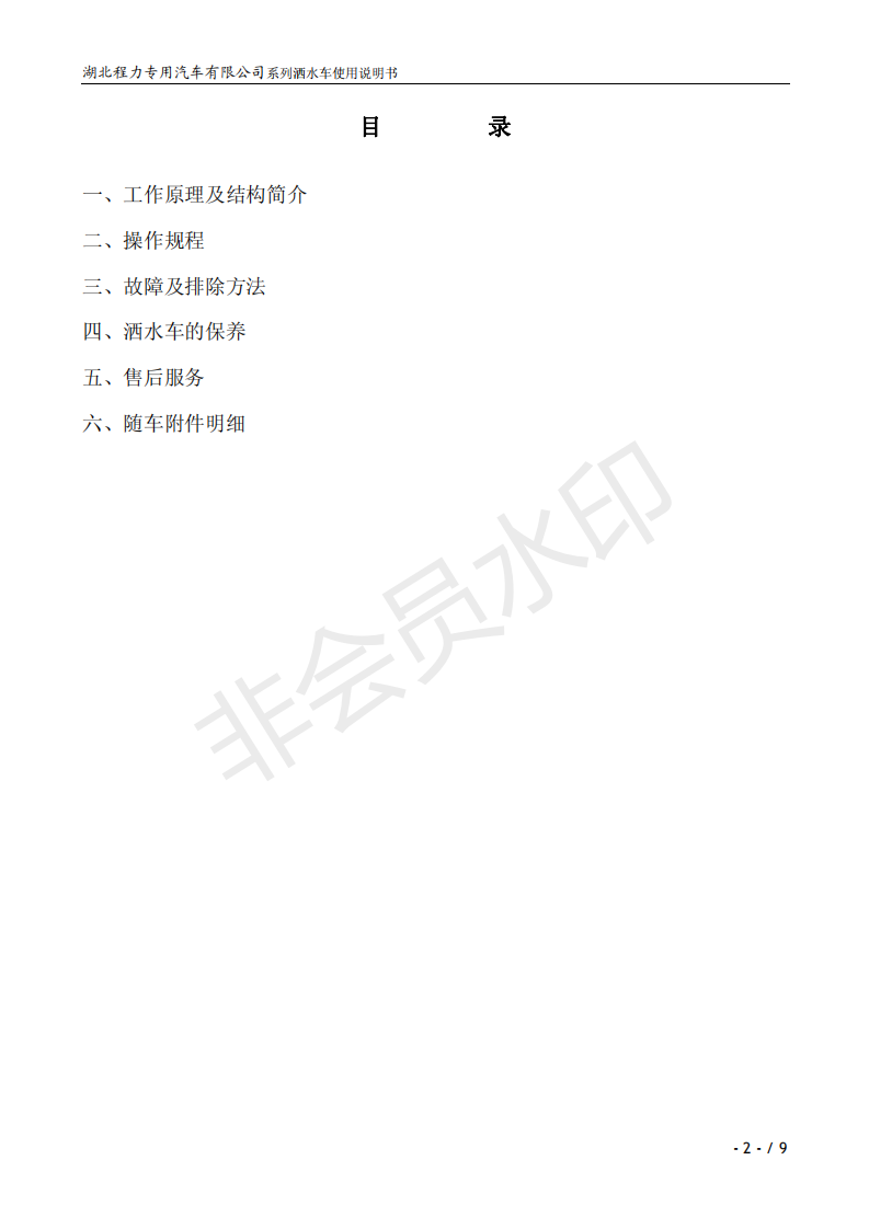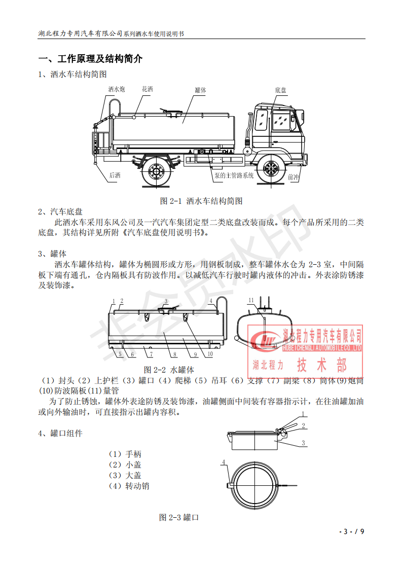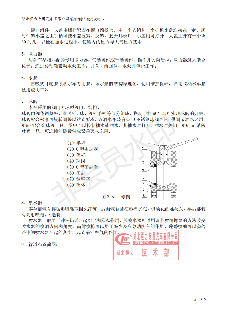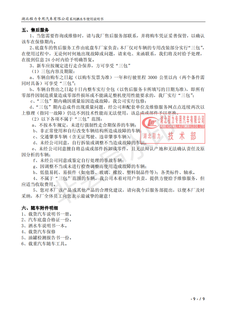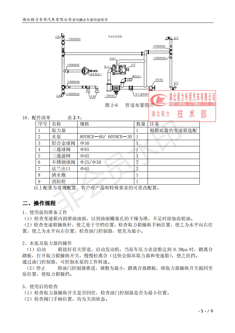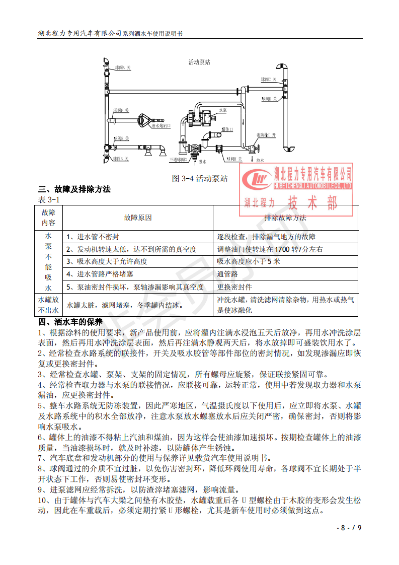 灑水泵情況說明:大功率專用灑水泵,采用國際領先意大利技術,在國內生產各系列專用泵已有50年歷史,產品質量成熟可靠,設計先進合理,使用方便快捷,比同類灑水泵壓力大、吸程遠、使用壽命長,克服其它灑水泵易被雜物纏住、壓力小、吸水慢的缺點,引領國內外灑水泵行業標準,市場占有率93%。關于湖北程力灑水車使用說明書介紹如下,用戶不清楚可以直接打印出來。