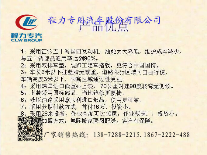 湖北程力公司生產的云梯搬家車的梯臂采用韓國整裝進口,因為韓國的搬家服務發展比較早,已經有了非常優質的服務和成熟的云梯技術。進口品牌的最大的優點在于質量穩定、經驗豐富、技術過關。再結合國內使用情況,進行了適當的調整和優化,使之更適用于中國國情。云梯搬家車的云梯單次載重400公斤,作業高度28米,可以用于工程租賃,幕墻施工、樓頂太陽能、樓頂防水作業,廣告高炮,電力維修,空調室外機安裝,船舶維護,搬家公司,水泥沙子搬運,路橋修護等多種功能。藍色牌照,C證駕駛,無需特種操作證。 (1)云梯采用韓國進口技術,部分部件采用韓國原廠整裝進口!另外,我公司通過引進、消化、改進,不斷完善云梯車的性能,也可根據客戶需求進行加裝,改進各項技術。 (2)公司在現有云梯基礎上研發出可以運送沙子的自卸貨斗。沙子運送到樓上以后貨斗自動傾斜將貨斗內的沙子卸下,這樣降低了我們的勞動成本,同時也節省了勞動時間。讓我們可以有更多的時間賺取更多的利潤。另外也有普通運貨貨斗可供選擇。 (3)配備80米無線遙控系統。夏天可以躲在陰涼處坐著板凳操作,運送水泥等粉塵多的作業時,也能遠離粉塵的吸入,工作視線一目了然。如果包天干活,沒有遙控操作系統,操作人員要站著一天,仰視著貨斗確實太辛苦。80米無線遙控包括整車啟動,貨斗升降,到達指定位置自動停止和液壓預熱器開關等。 (4)升降貨斗可以直達地面。大大的節省了人力,使作業更高效。另外貨斗展開后長寬為2m*2.4m。可以放較大體積的貨物。 相信品牌,相信 程力。我公司生產的云梯搬家車故障率低,操作更簡潔。快捷搬運搬家選云梯搬家車,讓您賺錢更好,更快!