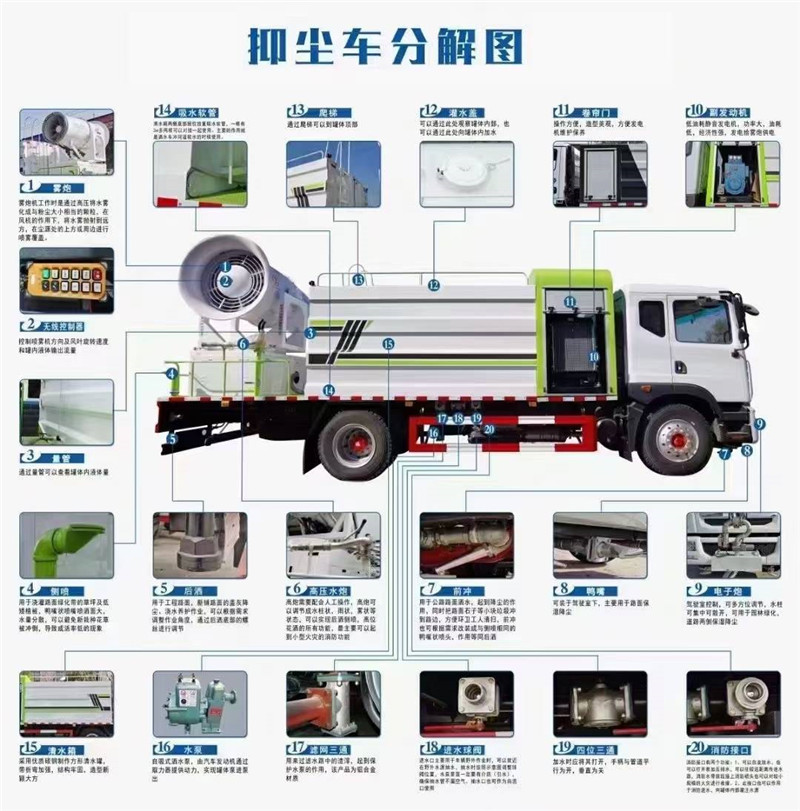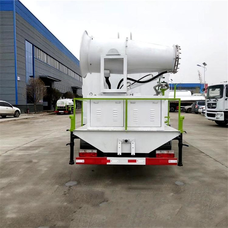 1、整車裝備、結構緊湊、布局合理、部件做工精細、產品配置完善、操作性能好。 2、霧炮射程遠、覆蓋面積大、霧粒細小、與飄起的塵埃接觸時,形成一種潮濕霧狀體,能快速將塵埃抑制降沉。 3、適用范圍廣、工作效率高、可邊行駛邊噴霧、噴霧速度快、對塵埃有較強的穿透力和霧珠附著力、能有效地節約用水量和減少環境污染。 4、遙控/手動兼容、起動快捷、使用安全、靈活方便、性價比高。 5、微電機控制水平旋轉,液壓馬達控制俯仰角度,交換角度速度快。 | 湖北程力國六多利卡8方抑塵車(方罐)程力威牌CLW5120TDYE6型多功能抑塵車圖片價格: